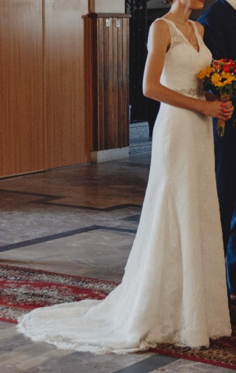 Mam do sprzedania efektowną prostą suknię koronkową z trenem. W talii ozdobiona jest mieniącym się srebrnym paskiem. Suknia jest w kolorze śmietankowym. Wyjątkowo podkreśla figurę i jest bardzo kobieca. Tren pięknie się układa i nie przeszkadza w chodzeniu, jest również możliwość podpięcia po zawiązaniu tasiemek pod suknią, co sprawia, że jest praktycznie niewidoczny, a jednocześnie nie przeszkadza. Suknia jest wygodna i lekka.