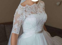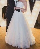 Gorset zapinany na zamek, zdobiony piękną koronką. Szyta na 170 cm + 8cm obcas. Suknia świeżo po pralni, ubrana tylko na weselu, nie była zabierana w plener. Suknia naprawdę w idealnym stanie. Dorzucam koronkowe bolerko zapinane na guziczki i koło.