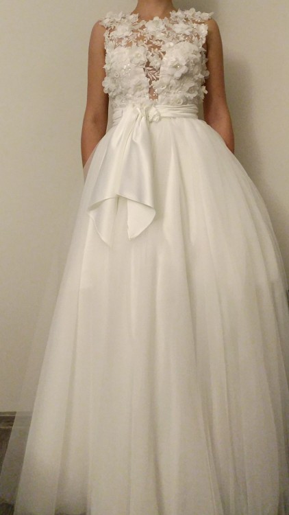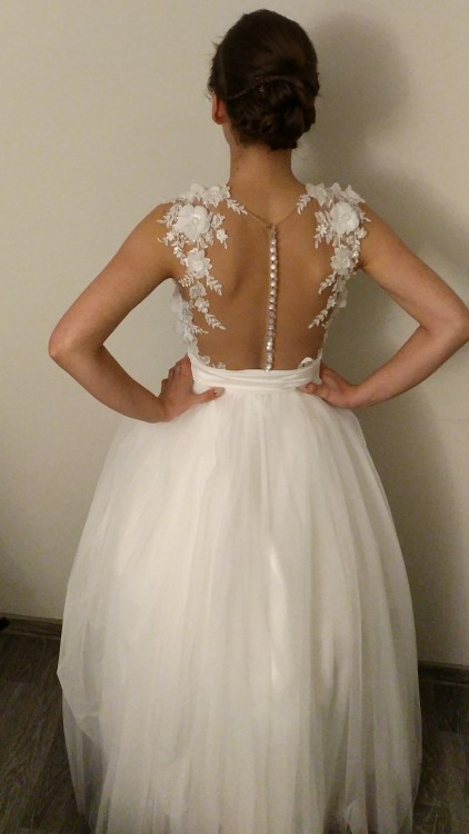 Suknia jest asymetryczna, posiada śliczne koronkowe wykończenia i efektowne zdobienia. Na wszystkich zrobiła ogromne wrażenie, jest bardzo wygodna, nie krępuje ruchów i można się w niej poczuć na prawdę wyjątkowo.
