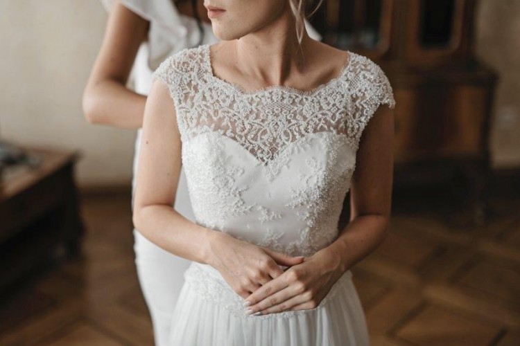 Suknia jest w kolorze złamanej bieli (śmietanka). Góra sukienki wykonana jest z delikatnej koronki z naszytymi koralikami, a dół ze zwiewnego muślinu. Suknia jest bardzo lekka i wygodna. Nie posiada żadnego usztywnienia, dzięki czemu bardzo naturalnie się układa. Suknia jest skromna, a zarazem elegancka.