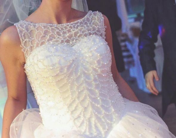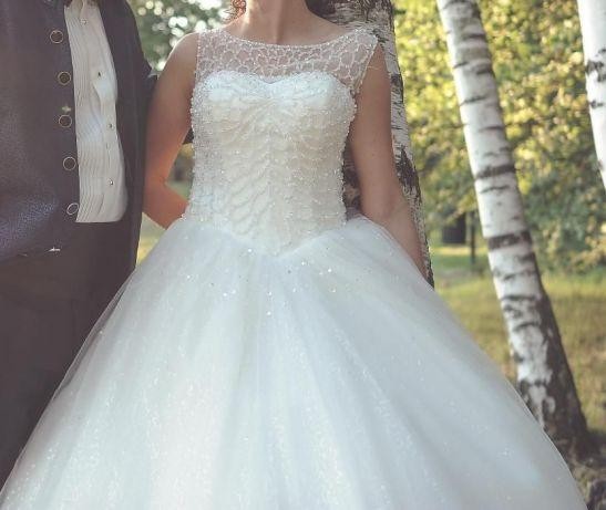 Suknia z gorsetem zapinanym na guziczki, dół na kole. Gorset posiada wiele mieniących się kryształków, dół z delikatną tekstura i cekinkami. Stan bardzo dobry, brakuje kilku kryształków. Goście jak i obsługa byli zachwyceni :)