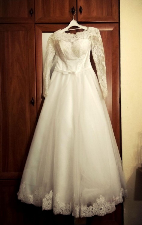 Suknia jest z kolekcji 2016, w kształcie literki A pięknie podkreślająca atuty figury- talię i biust. Góra sukni wykonana jest z koronki zdobionej delikatnymi koralikami, w pasie kokardka(którą można śmiało zamienić na aplikację, lub inny pas), a dół wykonany jest z wysokojakościowego tiulu, na dole uwieńczonego taką samą koronką jak na górze sukni.