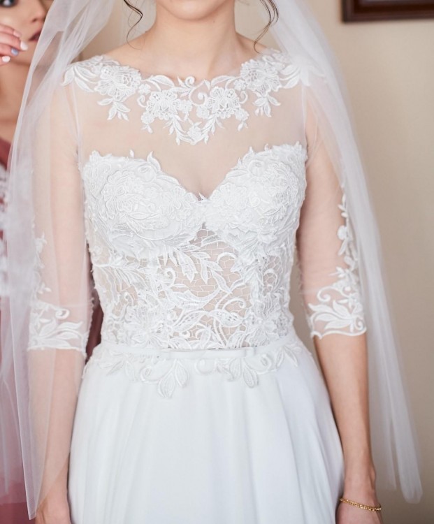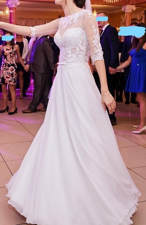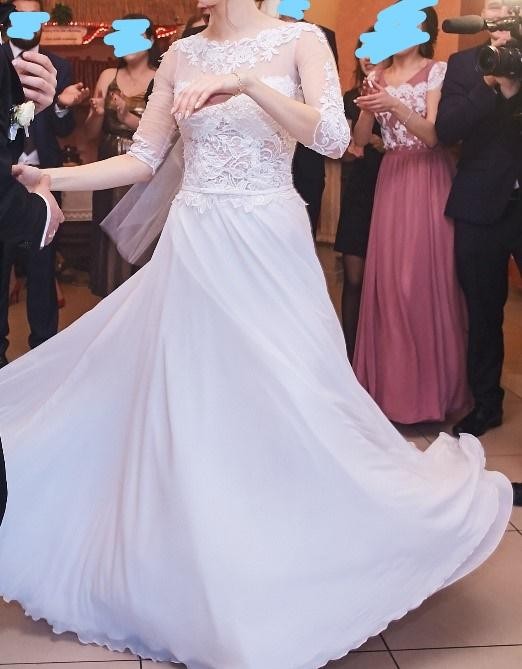 Mam do sprzedania suknie ślubną uszytą na zamówienie przez Alpinę Mróz. Suknia jest w kolorze śmietankowym (Ivory). Wykonana jest z materiałów wysokiej jakości. Dół sukni to muślin jedwabny, natomiast góra sukienki jest wykonana z gipiury. Wygodna do tańca.