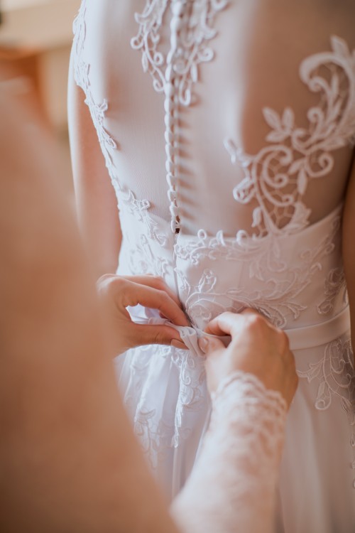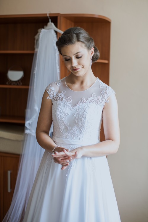 Suknia uszyta na wzrost 172 cm+ 5 cm obcas. Góra sukni pokryta gipiurową koronką, dół wykonany z bardzo lekkiego i zwiewnego muślinu. W pasie delikatny pasek, zapinany z tyłu na kokardkę.