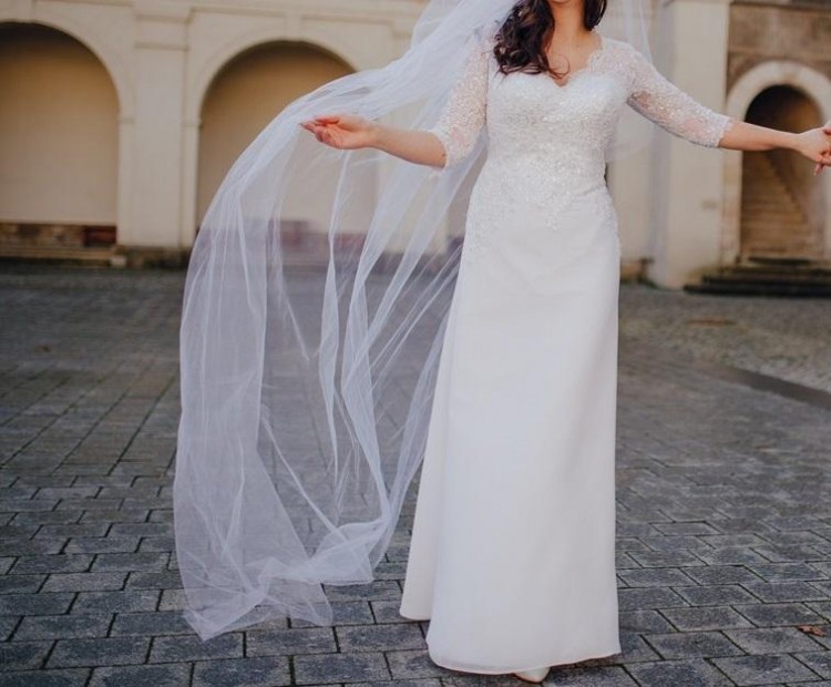 sprzedam białą suknie ślubną z długim welonem i etolą.