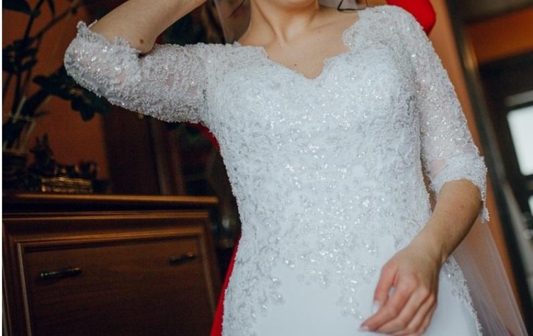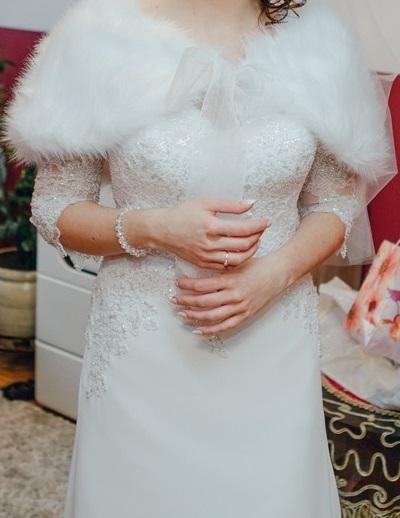 Sprzedam białą suknie ślubną z etolą na ramiona.