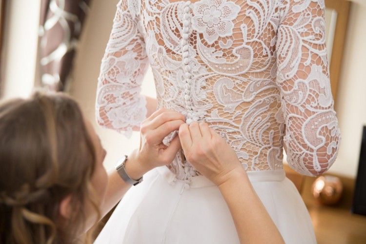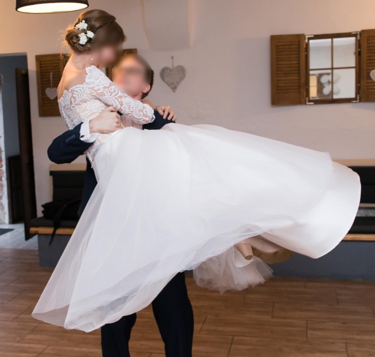 Suknia jest biała. Posiada wiązany gorset, który pozwala dopasować sukienkę do sylwetki. Beżowy kolor gorsetu podkreśla piękną białą gipiurę z rękawkami zapinaną na guziczki. Ponadto sukienka wyróżnia się dzięki asymetrycznemu wykończeniu gipiury.
