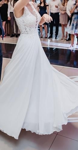 Sprzedam suknię ślubną zakupioną w Laura Dom Mody Ślubnej w Płocku. Koronkowa góra ze zdobieniami, wbudowane miseczki. Suknia posiada podpinany tren, kolor śmietankowy, dól sukni muślinowy- pięknie prezentuje się w tańcu. Suknia bardzo wygodna. Rozmiar 36, szyta na wzrost 166 +10 cm Cena 2200 zł z welonem 3m