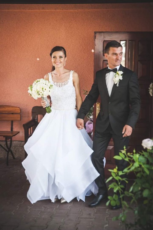Sprzedam bajeczną i nietuzinkową śnieżno białą suknię ślubną szytą dla rozmiaru 34/36. Suknia jest dwuczęściowa - góra była szyta ręcznie, jest pięknie zdobiona koralikami, natomiast dół sukni to spódnica składająca się z wielu warstw materiału, prześlicznie układa się w tańcu i co najważniejsze nie krępuje ruchów. Suknia założona na ślub i wesele oraz na sesję plenerową. Cena: 1500 zł. Możliwość przymiarki w miejscowości Gózd Lipiński - okolice Biłgoraja (woj. lubelskie).