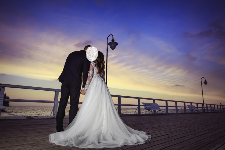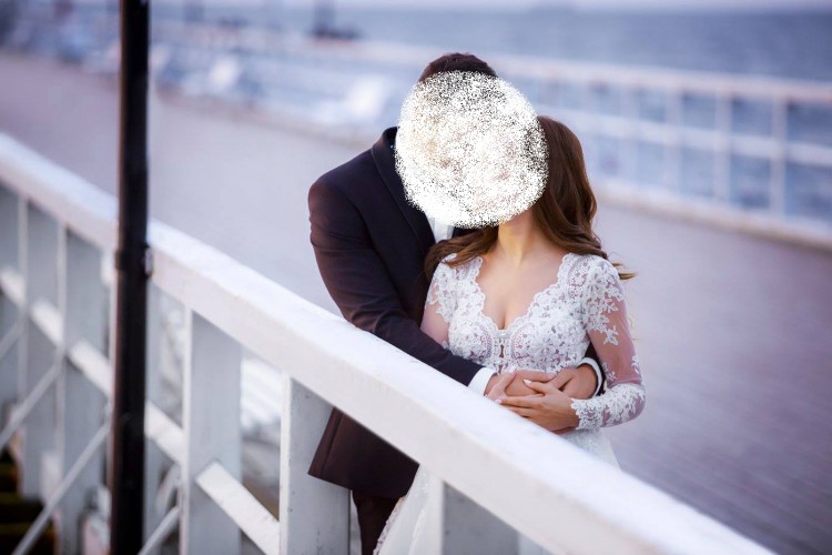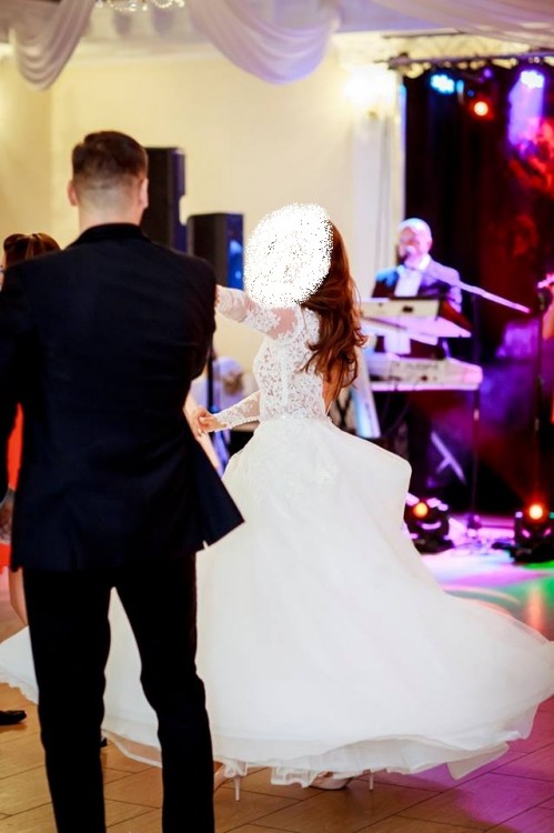 Suknia w rozmiarze 34/36 szyta była na wzrost 166 cm + 9 cm obcas. Suknia jest wykonana z przepięknej koronki. Dół wykonany jest z kilku warstw tiulu. Posiada długi podpinany tren oraz pięknie wycięte plecy w literę V. Suknia jest w kolorze jasnej śmietanki. Do sukni dokładam gratis ozdobę do włosów oraz 3 metrowy welon na grzebyku, który idealnie dopełnia całą stylizację.