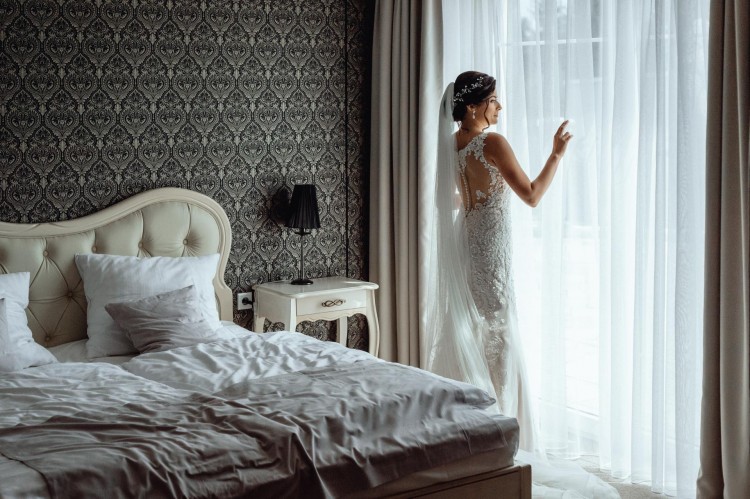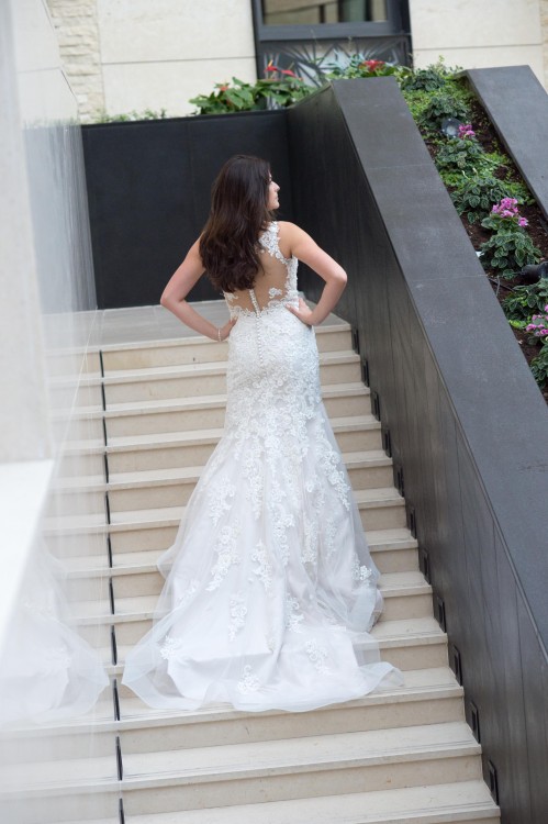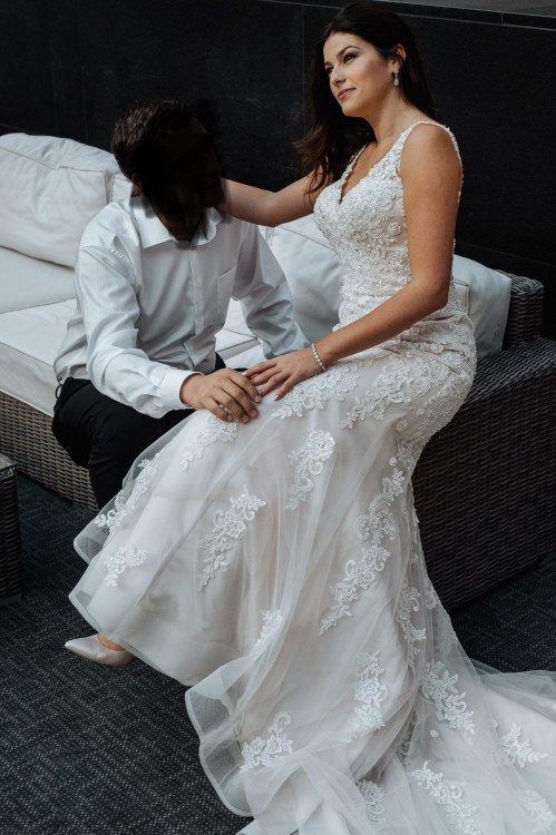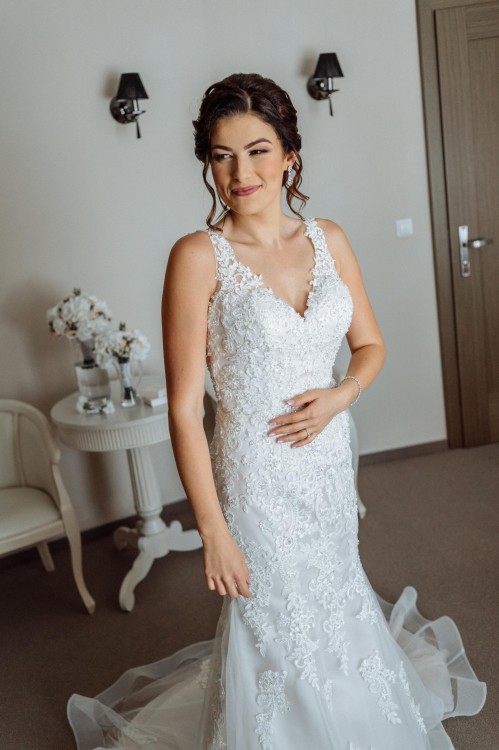 Suknia została zamówiona w salonie Miss Cherie w Tarnowie i jestem jej pierwszą włascicielką. Ma fason delikatnej rybki. Jest bogato zdobiona koronką i kryształkami , co nadaje jej elegancji. Największe wrażenie robią pięknie wyeksponowane plecy zabudowane tiulową siateczką, obszyte dodatkowo koronką oraz długi, ciągnący się tren. Tył zapinany zarówno na zamek jak i guziczki. Dla wygody użytkowania i żeby nie mieć otarć, ramiona obszyte są lekkim silikonem. Tren można bez problemu podpiąć, (pierwsza warstwa sukienki jest podpinana pod spód tylko koronka na wierzch) dzięki temu sukienka jest bardzo wygodna podczas tańca. Suknia szyta była na wzrost 166 cm + 8cm obcas.