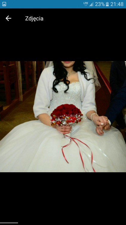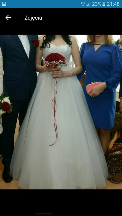 Sprzedam suknię ślubną , założoną raz ,w stanie idealnym . Kupiona w salonie sukni ślubnych Bellissima .Koszt sukni to 4.000 zł na co jest umowa kupna . Do sukni dorzucam welon z kryształkami ,2 bolerka , jedno grubsze , drugie z tiulu (wogole ogóle nie używane ) , biżuterię (naszyjnik nie używany ), kolczyki, bransoletke i dorzuce jeszcze buty baleriny (roz.38). Zapraszam na przymiarke i do zakupu ( suknia jest na osoby rozmiaru ok.36-38 , gorset regulowany , posiada przyczepiane ramiączka , które bez problemu można odczepic) . Koszt to 2000 zł (DO MAŁEJ NEGOCJACJI) .