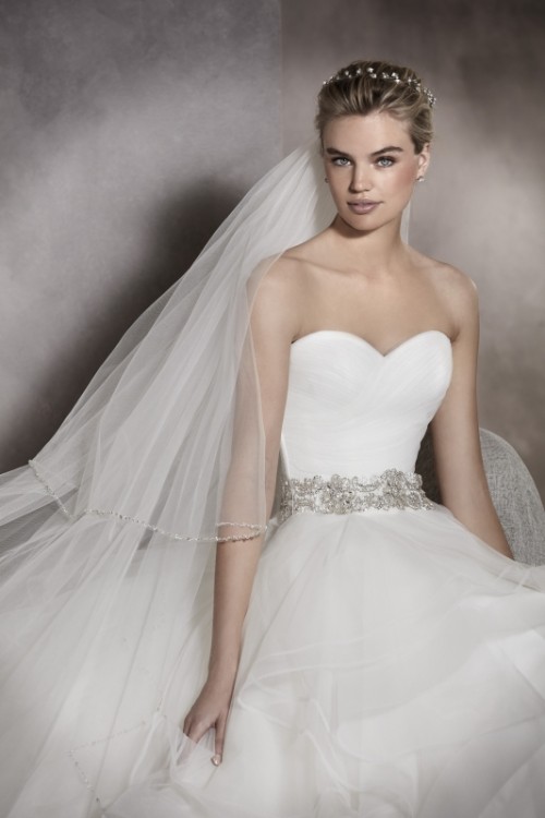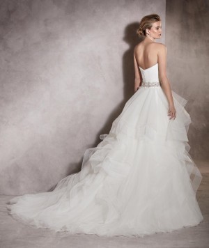Sprzedam piękną suknię ślubną ekskluzywnej marki Pronovias - model Albania. Tiulowe falbany tej sukni nadają jej trójwymiarowy wyraz. Gładki gorset wycięty w "serduszko" jest idealnym dopełnieniem. Falbany w sukni powodują, że jest ona niezwykle efektowna. Suknia jest w idealnym stanie. Suknia jest również wyprana. Cena katalogowa zaczyna się od 9700 zł. Do sukni za darmo dołączam piękny długi welon oraz oryginalny pokrowiec.