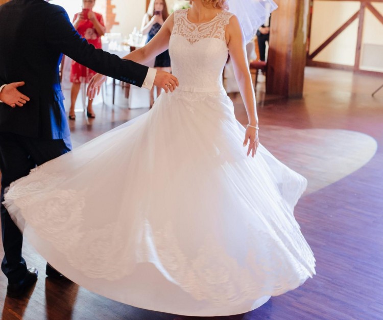 Suknia jest na kole dzięki czemu pięknie się kręci i prezentuje.