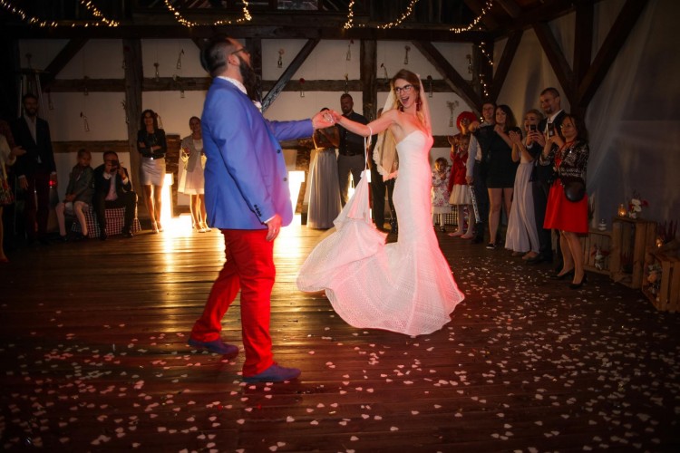 Suknia lekka, pięknie pracuje w tańcu,a dodatkowa możliwość podpięcia trenu o magiczny guziczek znacznie ułatwia sprawę.