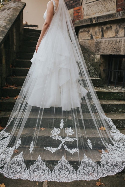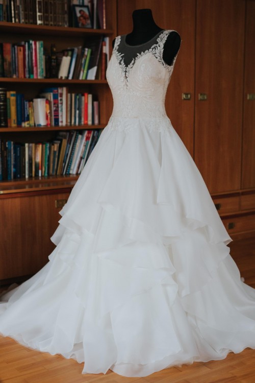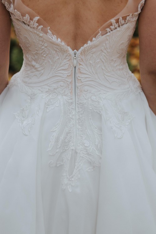 Suknia o nieco zmodyfikowanym projekcie produkcji Maxima 4618 Angel z doszytą majestatyczną koronką Raisa w kolorze ecru.
