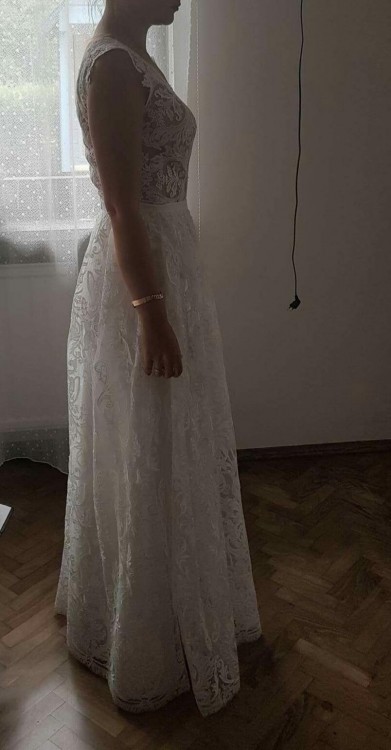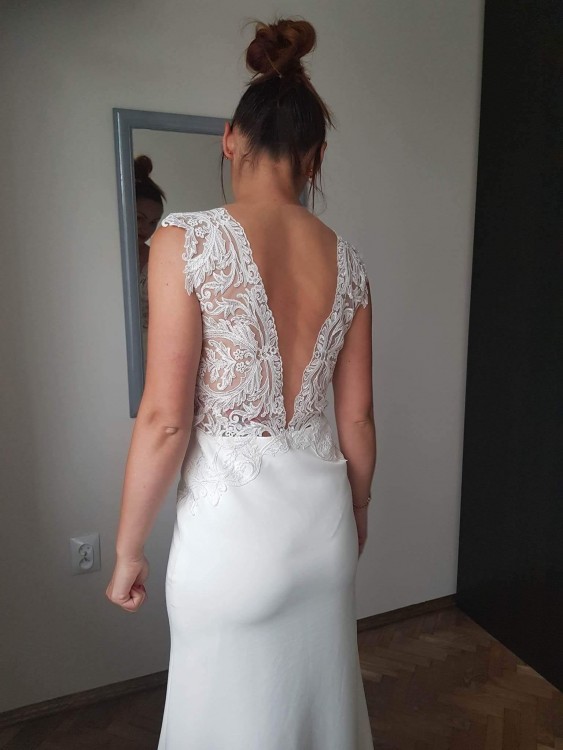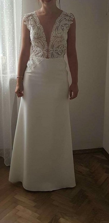 Suknia sklada się z dwóch czesci pierwsza z koronkowej spodnicy,ktora mozna sciagnac i zostaje subtelna suknia. Suknia szyta na miare. Serdecznie zachecam do zakupu. Cena w salonie 5500 złotych