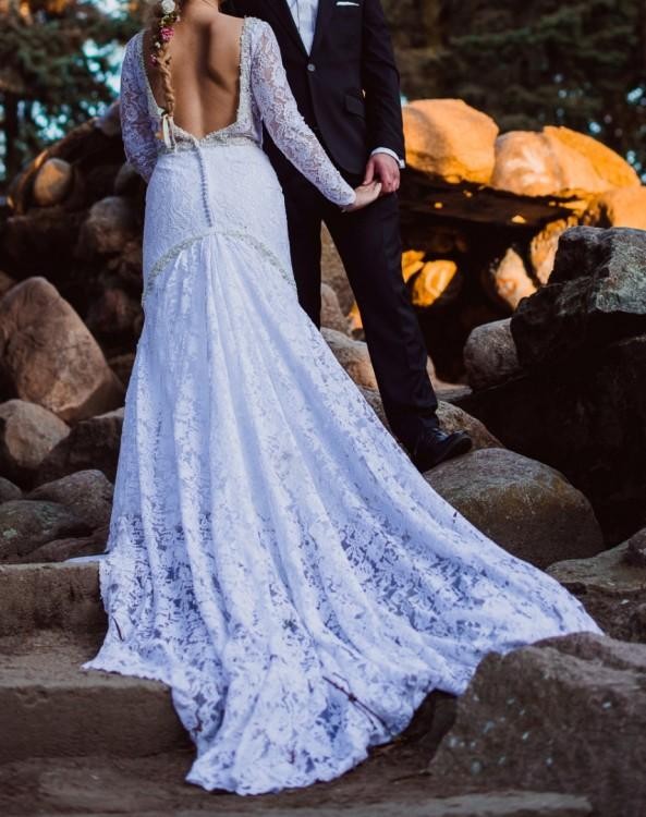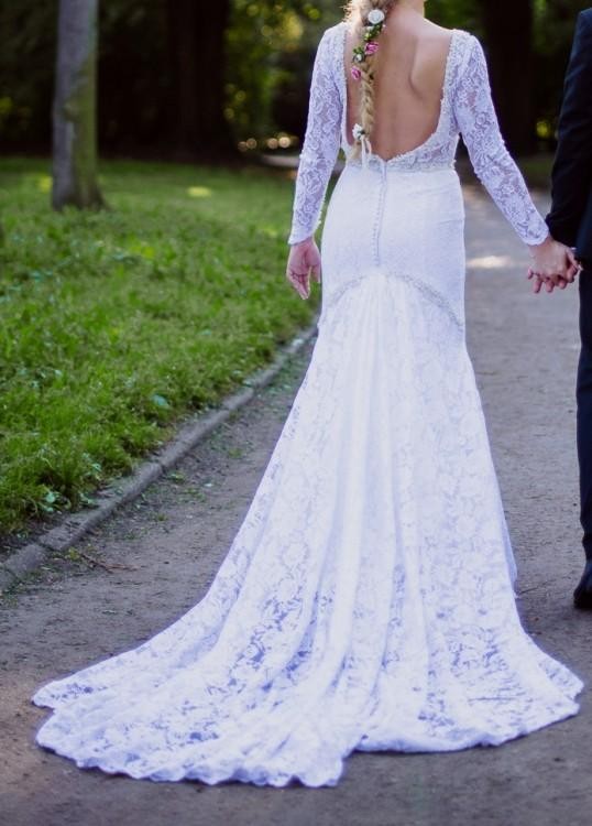 Koronkowa suknia z długim trenem i głęboko wyciętymi plecami. Całość wykończona kamieniami... Wesele w klimacie romantycznym