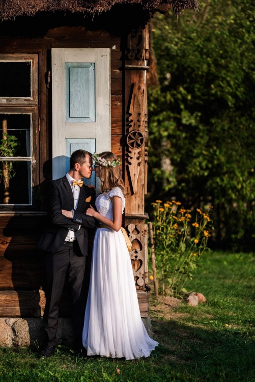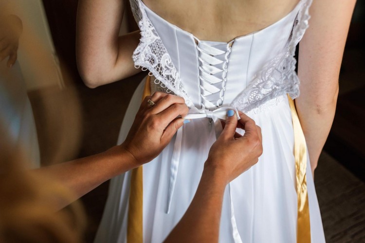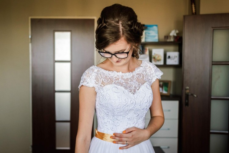 Suknia jest śnieżnobiała, ma krój w kształcie litery A. Jest bardzo wygodna i lekka, ponieważ dół uszyty jest ze zwiewnego, delikatnego muślinu, który pięknie układa się podczas tańca i zabaw oraz jest odporny na wszelkiego rodzaju gniecenia. Góra obszyta jest uroczą, lekko połyskującą koronką we wzorze kwiatowym. Suknia ma dopasowany do ciała gorset i wszyty biustonosz. Z tyłu zapinana jest na zamek, następnie wiązana w gorsecie do połowy pleców, a na wierzchu zapinana na małe guziczki, przez co wiązania zostają ukryte pod koronką. Do sukni dopasowałam wstążkę o kolorze żółtym, pasującą do motywu ślubu. Do prania chemicznego musiałam ją odpruć, ale bez problemu można doszyć pasek o dowolnym kolorze.