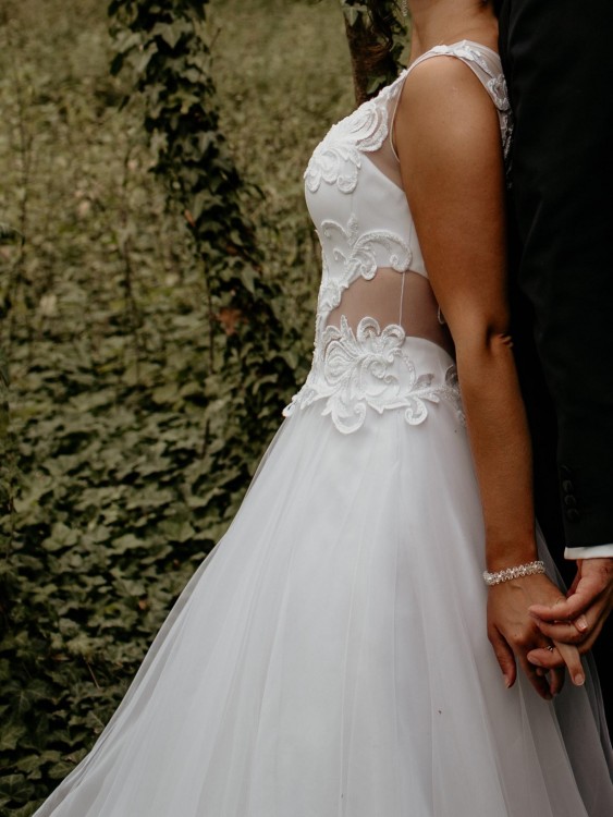 Śnieżnobiała suknia ślubna z siateczkowymi wycięciami pięknie modelującymi talię z długim 2 m welonem.