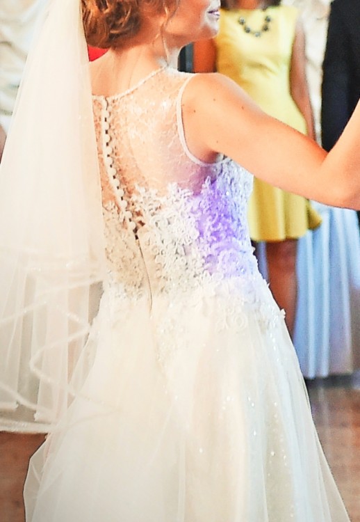-Suknia jest lekka, wygodna i nie krępuje ruchów. Zapinana na zamek, który ukryty jest pod rzędem stylowych guziczków, z podpinanym trenem (tren składa się z dwóch warstw).