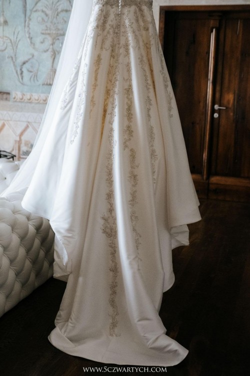 Suknia jest w kolorze ivory z bogatymi zdobieniami w postaci kamieni.