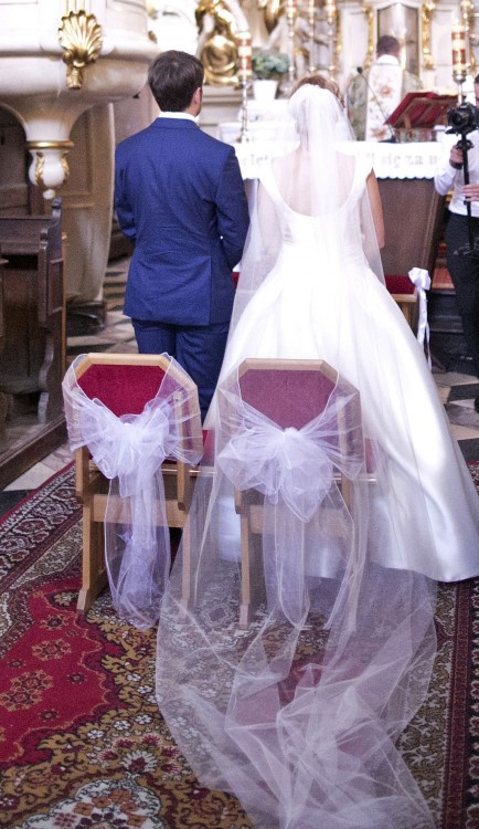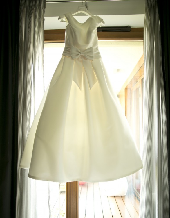 KRÓJ - księżniczka, kieszenie, kokarda z przodu, dekolt w łódkę z przodu, głęboki dekolt z tyłu, BEZ trenu, zaszewki na ramiączka stanika