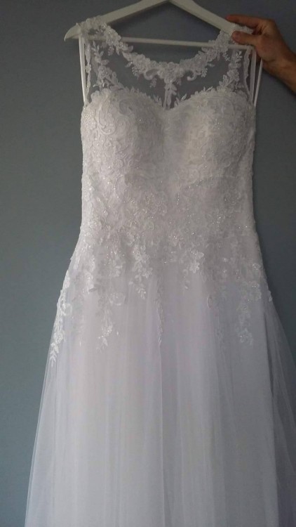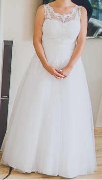 Materiał to połączenie tiulu i koronki, szyta na zamówienie. Suknia posiada wszyte miseczki od stanika, świetnie układa się przy dużym biuście, jednocześnie mocno go trzymając. Zapinana na zamek i perłowe guzki.