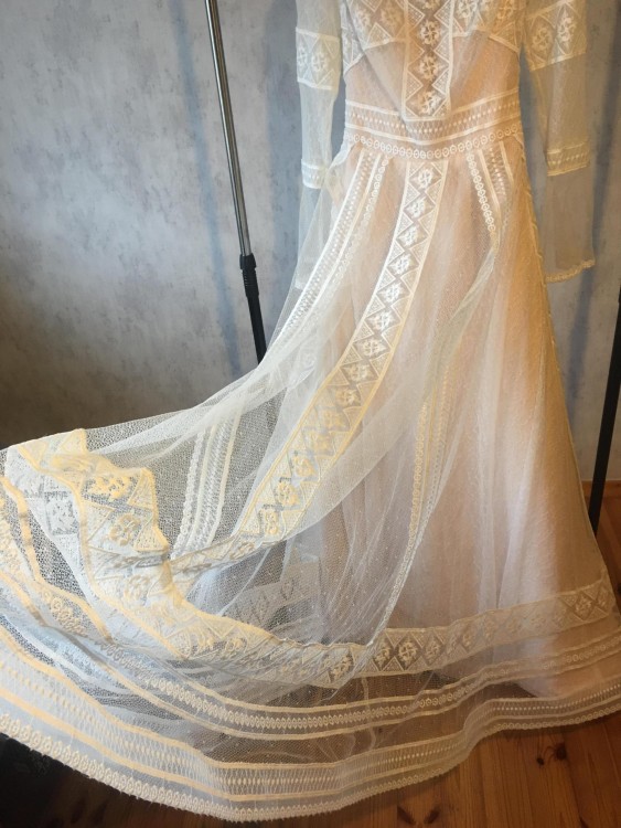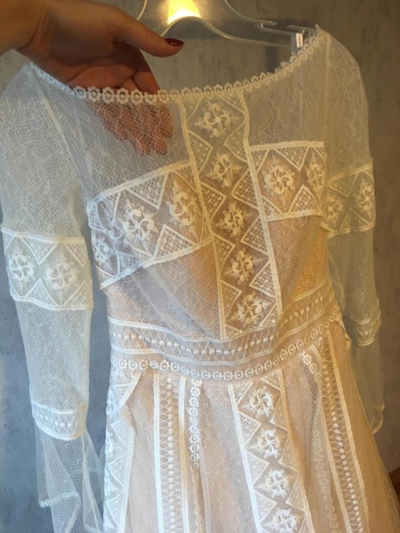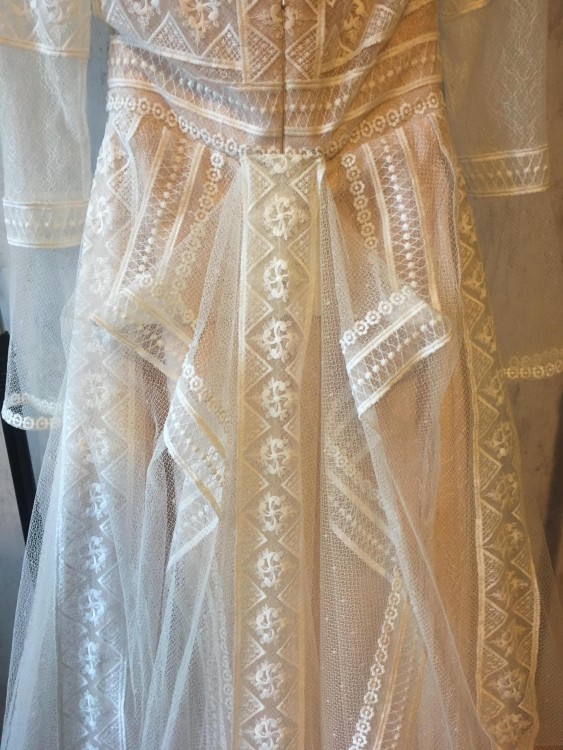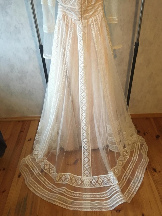 Z bólem serca sprzedam suknie ślubna firmy Tesoro. Rozmiar 38. W zestawie koło. Suknia jest uprana i odświeżona. Piękna koronka, dekolt w łódkę. Długość całkowita: 150 cm. Szerokość w biodrach: 34 cm. Długość rękawa: 64 cm. Szerokość rękawków: 14 cm. Szerokość w ramionach: 39 cm. Delikatny tren, przypinany na dwa guziczki zatrzaskowe.