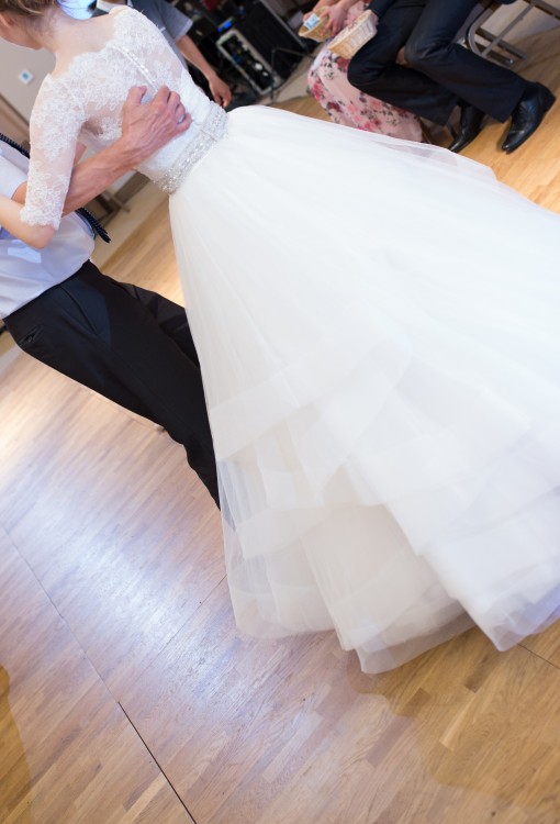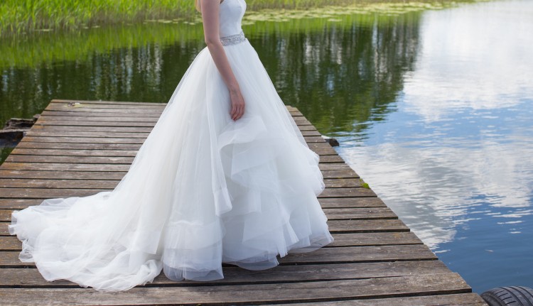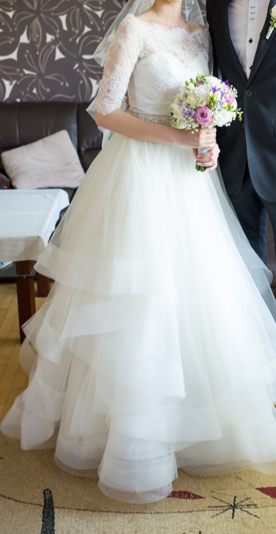 Jest to suknia w stylu księżniczki, gorset uszyty z jedwabiu dupion, dekolt w serduszko, talia podkreślona pasem , szeroka tiulowa spódnica. Suknia posiada tren podpinany na guzik (dzięki warstwom, które tworzą suknię tren nie wydaje się być ‘doczepionym’ i bardzo ładnie współgra z całością sukni tworząc kolejne warstwy). Gorset posiada gumki podtrzymujące suknię, zamek i guziki. Do sukni mogę dołączyć welon – dopasowany do sukni (z takiego samego tiulowego materiału i tak samo zakończony jak dół sukni) oraz „koszulkę” z francuskiej koronki. Suknia pięknie wygląda zarówno w kościele – dzięki trenowi oraz w tańcu – dzięki kolejnym warstwom, które tworzą fajny efekt. Cena 1600. Cena sukni w salonie to 4900 plus welon i koszulka. Suknia została dopasowana na wzrost 171 plus obcas 5 cm talia około 71 cm.