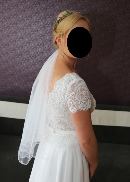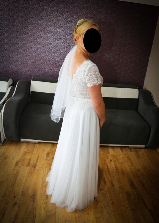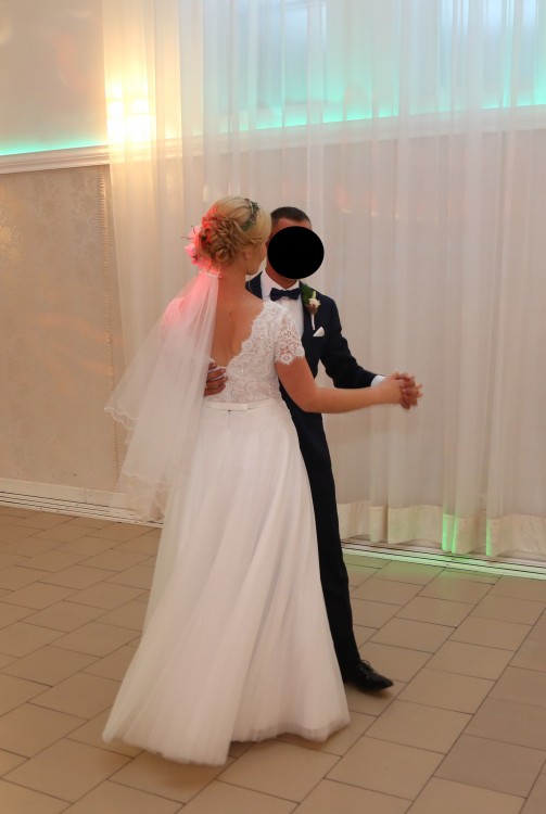 Sukienka lekka, zwiewna i romantyczna. Bardzo wygodna, nie ogranicza ruchów w tańcu. Suknia szyta na miarę, góra sukienki jest wykonana z koronki, z małymi zdobieniami. Natomiast dół sukni wykonany jest z pięknie układającego się w tańcu tiulu. Suknia jest po praniu chemicznym. Lekko uszkodzony dół sukni, warstwa tiulu uszkodzona obcasem. Po niewielkim skróceniu sukni, uszkodzenie zostanie usunięte. Polecam bo jest naprawdę śliczna ;)
