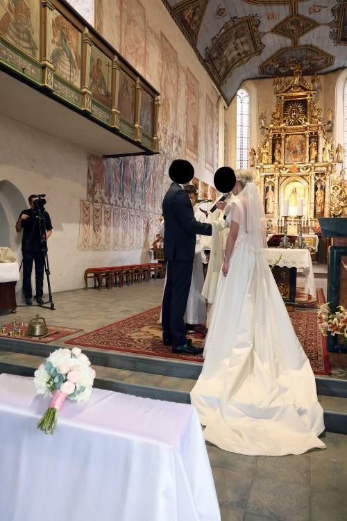 Suknia jest bardzo wygodna, posiada szerokie ramiączka, z tyłu zapinana na zamek, z wszytymi wkładkami zamiast biustonosza. Bardzo wygodny tren podpinany na guziki, dzięki czemu nie robią się tzw. "kieszenie'. Suknia wykonana jest ze specjalnego gatunku jedwabiu MIKADO, dzięki czemu jest lekka i wygodna.