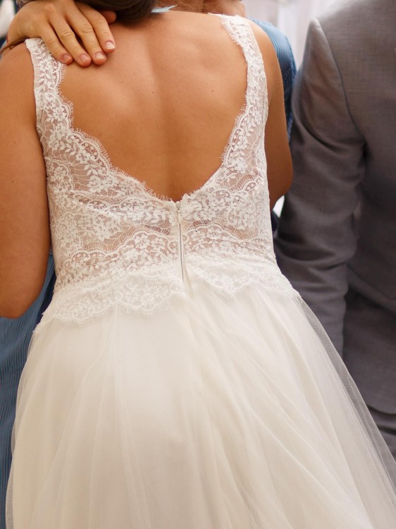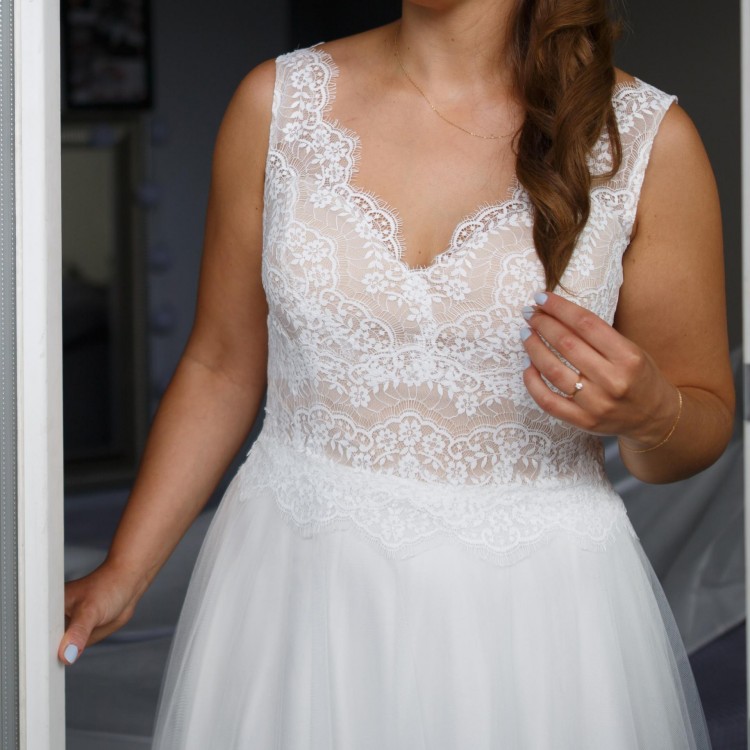 Po ślubie oczywiście wyprana, nie ma praktycznie żadnych zniszczeń, jedno malutkie przedarcie koronki które ledwo widać, łatwo przykleić lub zaszyć.