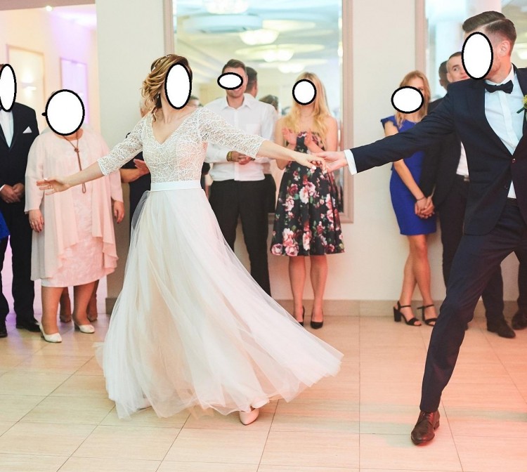 Dół składa się z dwóch warstw podszewki i trzech warstw tiul. Pierwsza warstwa tiulu w kolorze "brzoskwiniowym", dwie kolejne są białe, daje to niesamowity efekt przy każdym ruchu. Górę i dół oddziela biała tasiemka, co podkreśla wcięcie w tali..