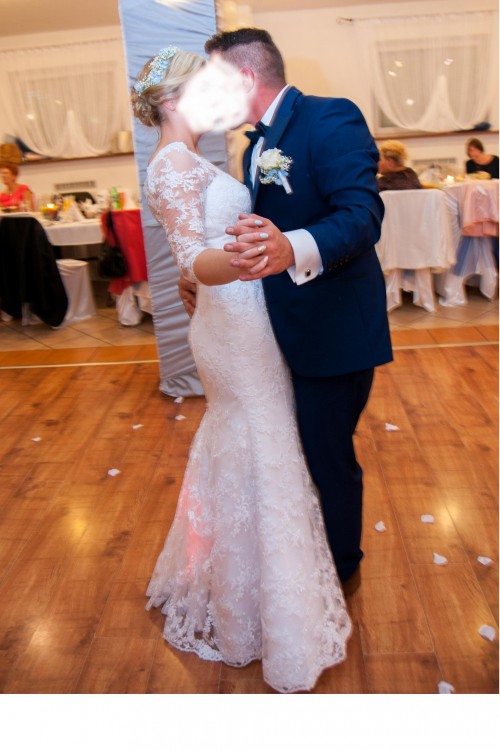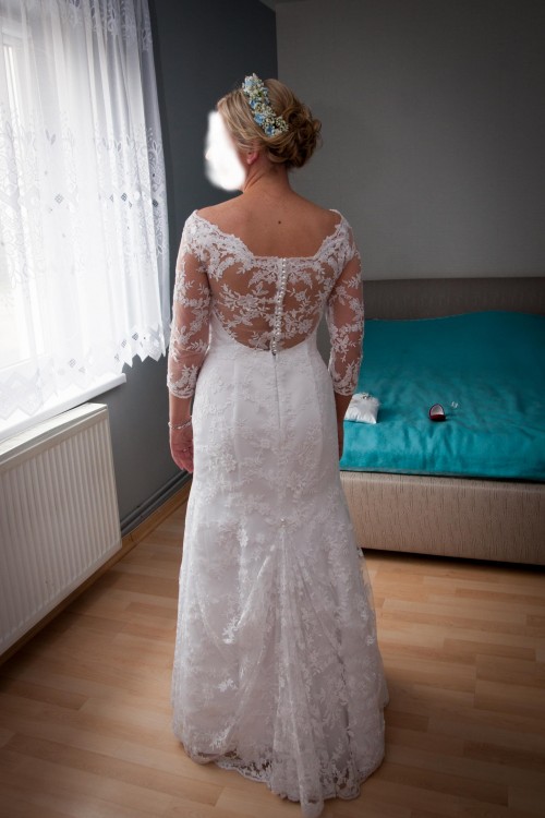 Suknia jest subtelna, ale koronka którą jest pokryta dodaje jej bogactwa i elegancji. Suknia idealnie podkreśla kobiece kształty. Jest bardzo wygodna i lekka. Tren z możliwością podpięcia, cała w delikatnej koronce, dekolt w łódkę, plecy wykończone perełkowymi guziczkami. Wszyty jest biustonosz w roz. 70B, który bez problemu można wymienić. Suknia była prana chemicznie zaraz po weselu. Więcej informacji pod numerem telefonu 0048609271445. Polecam !!!!