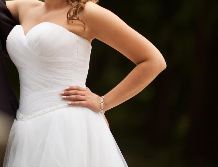 Można bez problemu ją skrócić gdyż tiul na dole jest cięty. Suknia jest jednoczęściowa, z wiązanym z tyłu gorsetem, dzięki czemu bardzo dobrze dopasowuje się do sylwetki i doskonale trzyma się bez ramiączek.