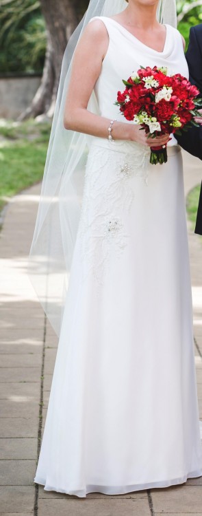 Sukienka lekko przerobiona- zmienione zdobienia, dekolt i wcięcie na plecach, brak trenu.