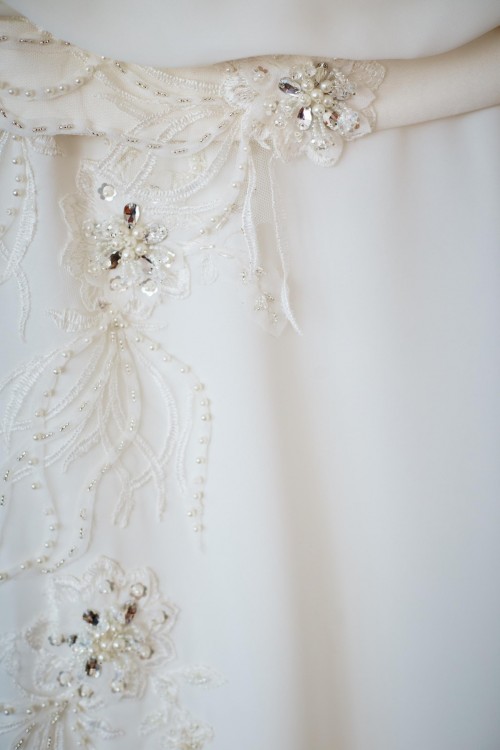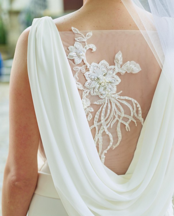 Plecy obszyte bardzo delikatnym materiałem, na którym widoczna jest koronka spójna z ozdobami na biodrze i pasku. Efekt lejącego materiału przepięknie podkreśla i uwypukla zdobienie pleców i jest efektem „wow” całej sukni.