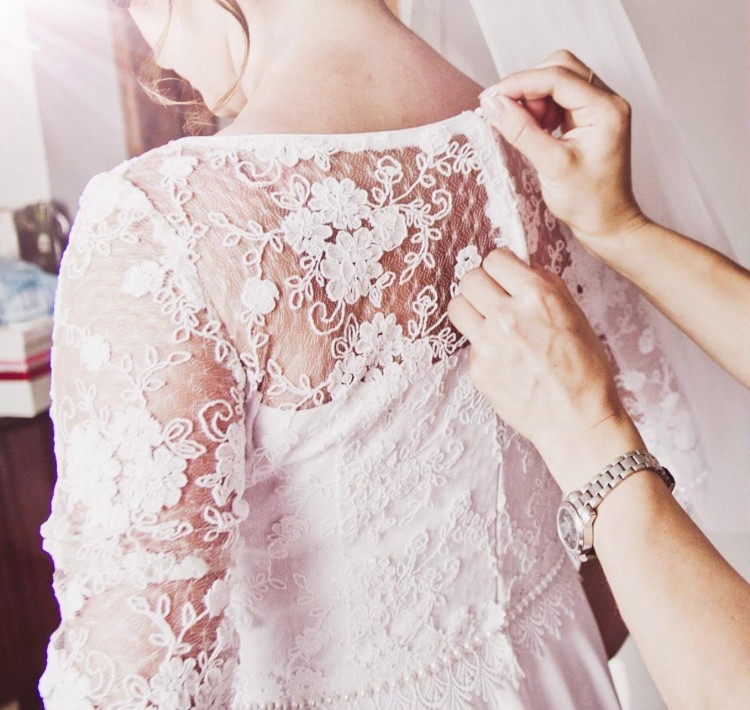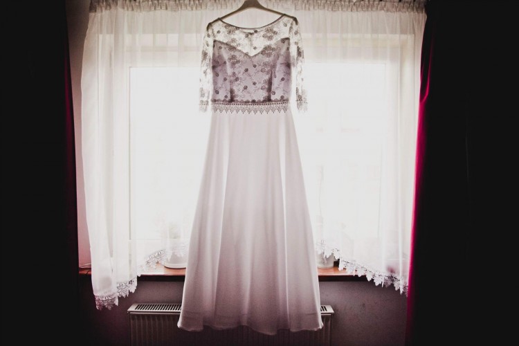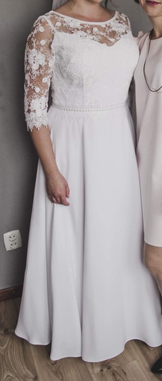 Góra sukni uszyta z delikatnej koronki, w pasie i na rękawkach ozdobiona perełkami.