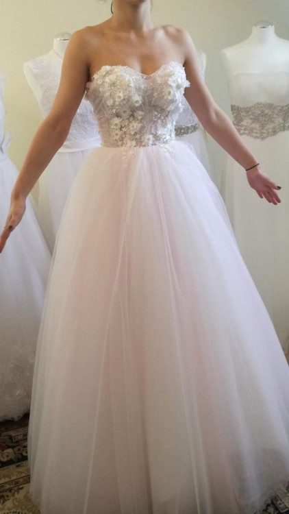 Suknia była szyta na wzrost 164 plus 9 cm obcas. Założona raz na wesele- jest w stanie idealnym po praniu chemicznym. Jedna warstwa jest w kolorze pudrowego różu, na gorsecie ręcznie wyszywane kwiatki, pod nim spód z koronki. Suknia ma również dopinane szeleczki- ja ich użyłam na pierwszy taniec, później odpięłam. Tiul prezentuje się bardzo lekko, nie sprawia wrażenia "bezy". Do sukni dołączam gratis 3-metrowy welon plus ozdobę do włosów i kolczyki, jeśli tylko będzie takie życzenie:) Możliwość przymiarki w Rzeszowie. Suknia powaliła gości i wspaniałego męża na kolana, więc gorąco polecam:)