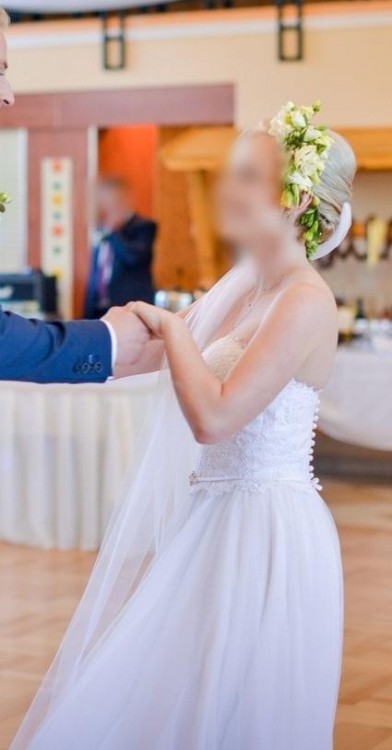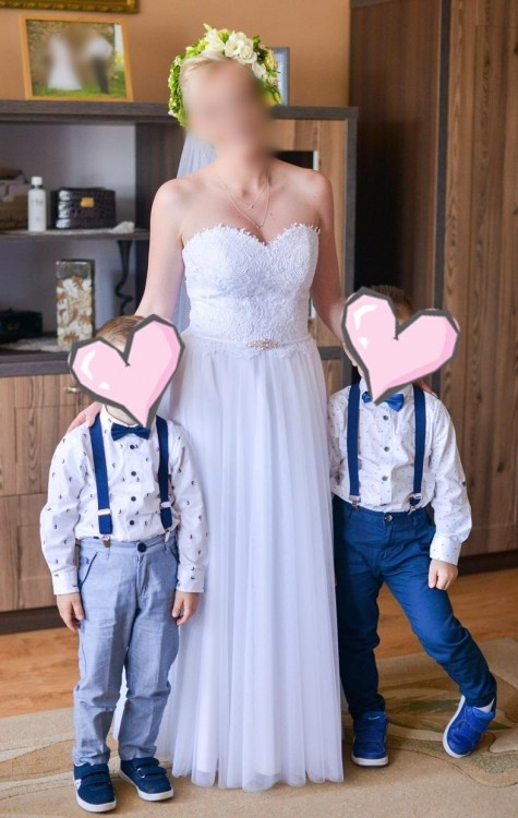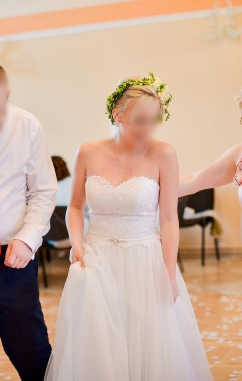 Suknia została ubrana dwukrotnie: w dniu ślubu i w dniu sesji plenerowej. Została dokładnie wyczyszczona. Do sukni dorzucam również szelki, które nie zostały użyte.