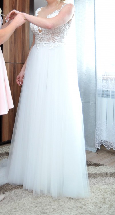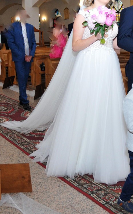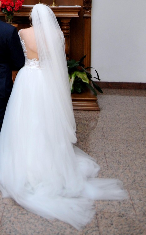 Sprzedam moja wymarzoną suknię ślubną, rozmiar 34/36. Góra sukni zdobiona piękną gipiurą, plecki w wiekszości odkryte. Tył sukni jest dłuższy( co pięknie prezentuje się z długim welonem) delikatnie ciągnie się po ziemi, dlatego też jest podpinany. Do sukni dołączam gratis : 3-metrowy welon szyty pod suknię, halkę z kołem (na zdjęciach suknia bez halki) oraz piękną ozdobę do włosów ( widać ją na jednym ze zdjęć). Cena do negocjacji.