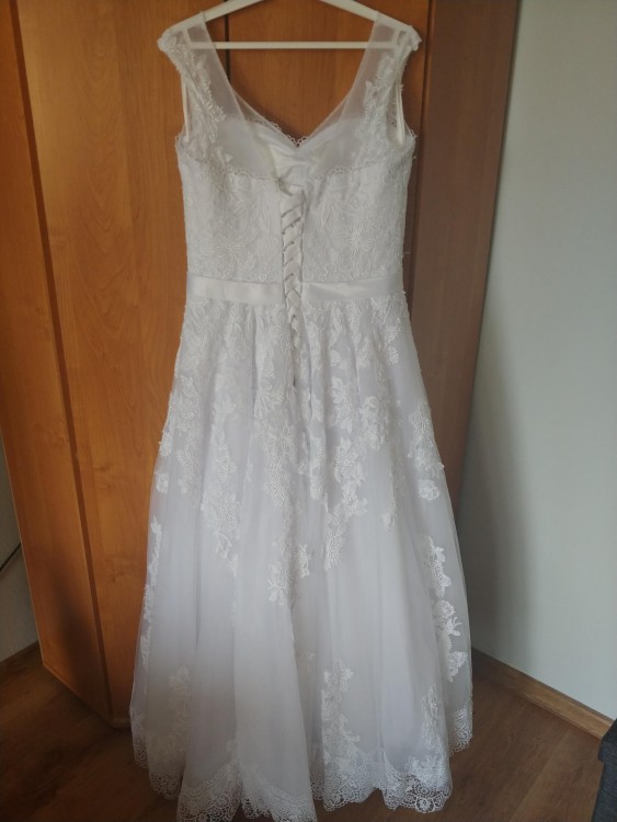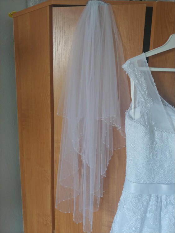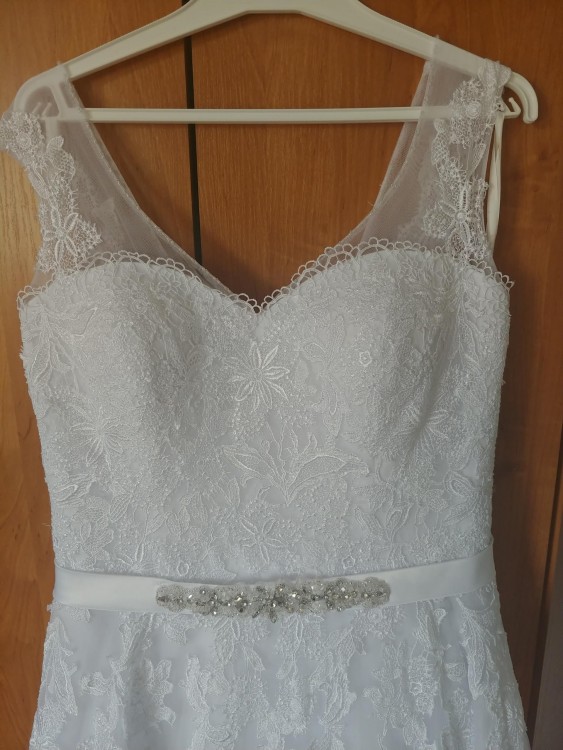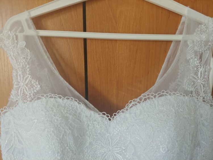 Suknia szyta na wzrost 175cm + 4cm obcas, rozmiar 42/44. Ramiączka sukni wykonane są z siateczki wykończone koronką oraz drobnymi kamyczkami. Do sukni dodam welon jako gratis.