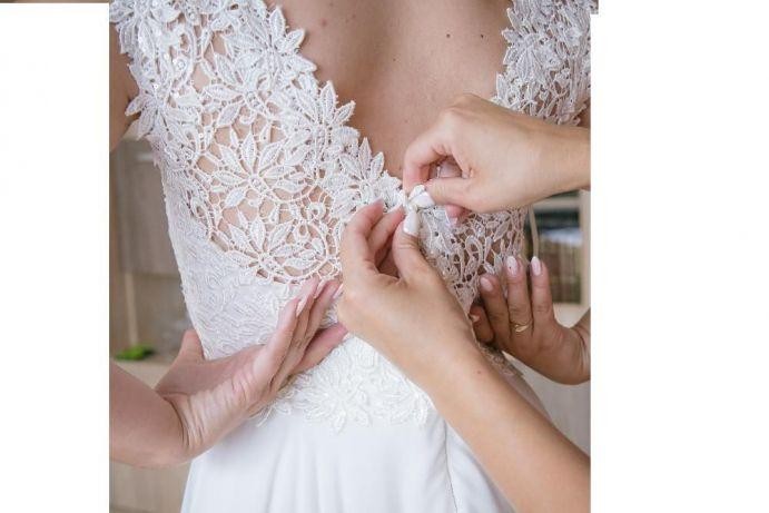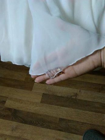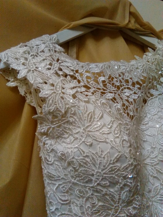 Jest lekko uszkodzona na dole sukni, co widać na zdjęciu. Każda krawcowa ją podszyje