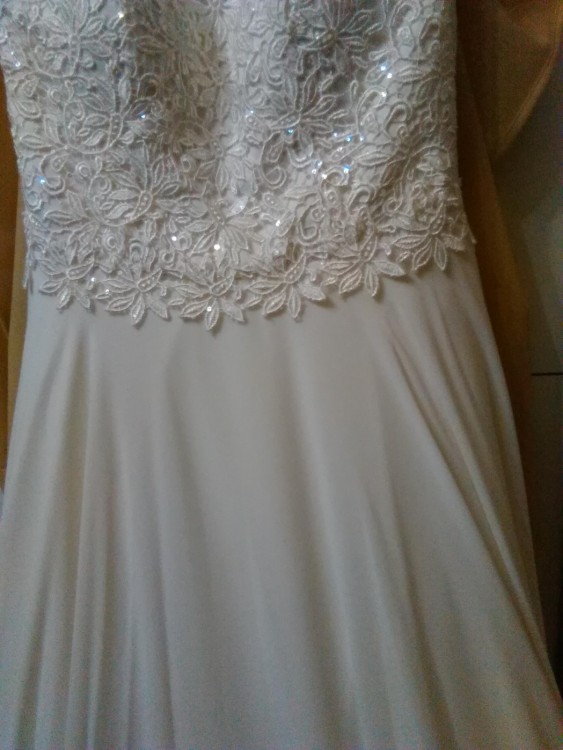 Mam do sprzedania suknie ślubną rozmiar 36-38 (na wzrost 166cm, przy obcasie 5-6cm), kolor ecru, na zdjęciach wychodzi biała.Wykonana z satyny i muślinu. Góra zrobiona z gipiury z cekinami, dół lekko usztywniony.