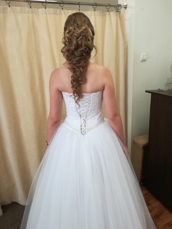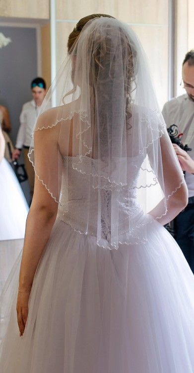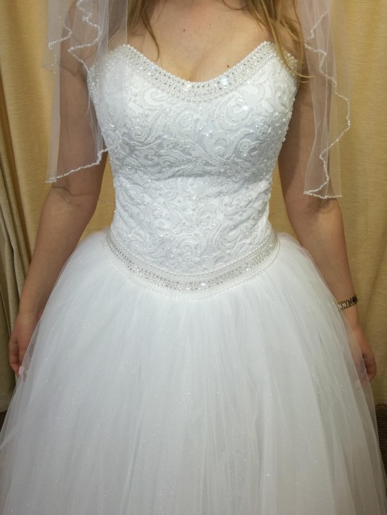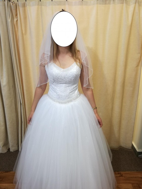 Gorset posiada wyszywane wzory wraz z błyszczącym brokatem oraz perełkami. Tył sukni sznurowany. Dół sukni w brokacie. Cała suknia jest koloru śnieżnobiałego. Dołączam welon ze świecącymi koralikami idealnie pasujący do całej kreacji. Suknia szyta na rozmiar 38/40 na wzrost 173 cm. Cena do negocjacji. Jeżeli chcesz wyglądać wyjątkowo i pięknie jak księżniczka na ślubie to naprawdę polecam! Zdjęcia nie odzwierciedlają śnieżnej bieli oraz połysku gorsetu i tiulu.