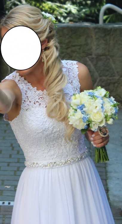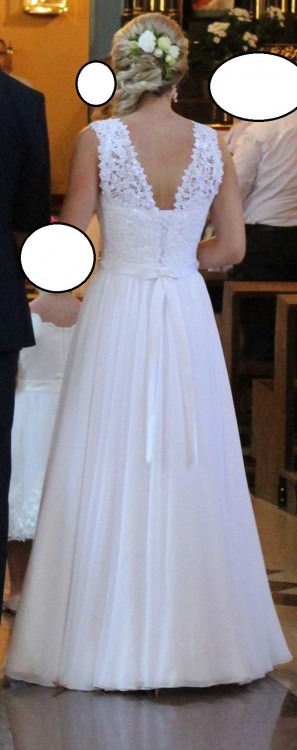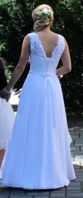 W tali wszyty pasek z kamyczkami biało srebrnymi – to właśnie on moim zdaniem nadaje cały urok sukni. Z tyłu pasek przechodzi w wdzięczną kokardkę. Plecy lekko odkryte.