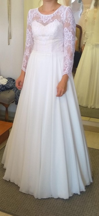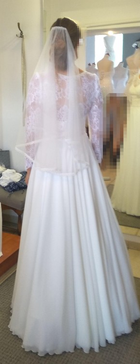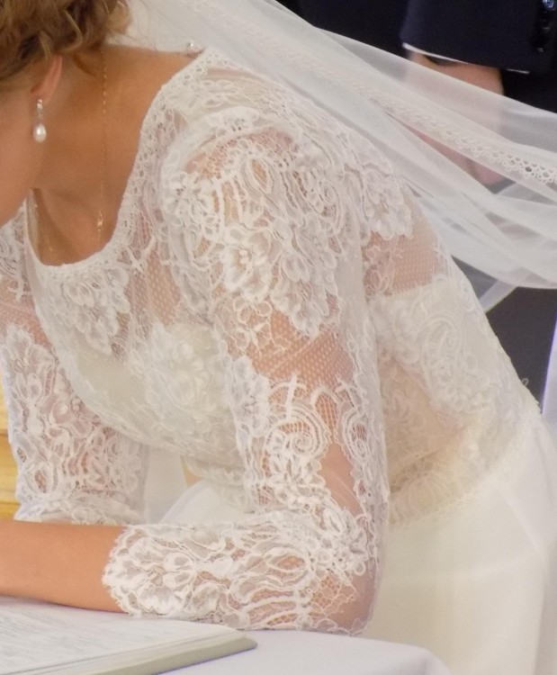 Góra sukni składa się z koronkowego bolerka wszytego na stałe z długim rękawem zapinanego z tyłu na guziki. Delikatna koronka nie zostawia ran na ciele. Nie krępuje ruchów i jest bardzo lekka. W talii wszyta została ozdobna tasiemka, którą obszyte zostały też welony.