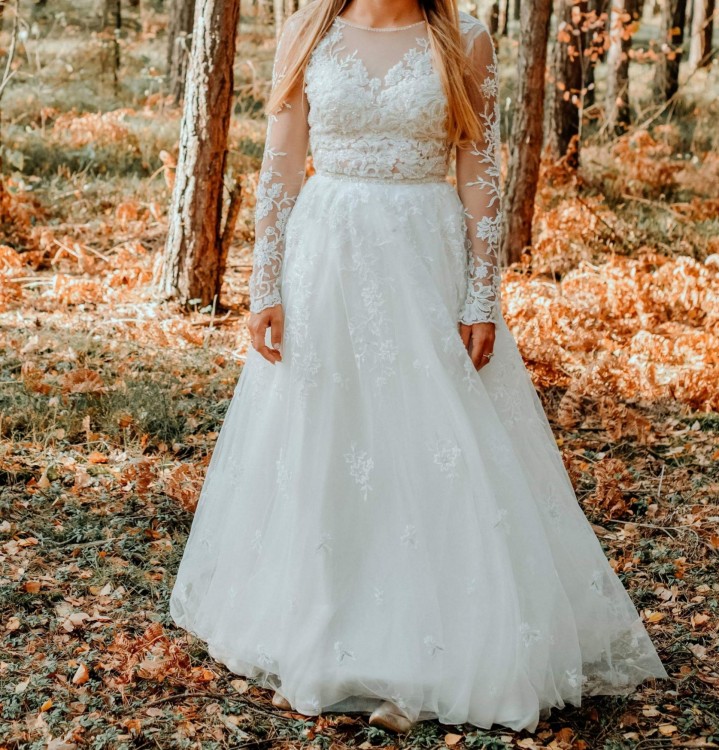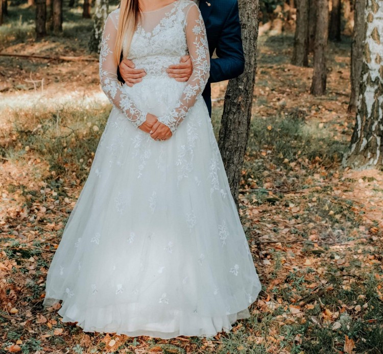 Witam. Sprzedam suknie ślubną z koronkowymi rękawami w kolorze ivory, rozmiar 36.Góra sukni posiada delikatna koronke recznie naszywana. Plecy są wycięte w literę,, V". Dół sukni posiada warstwy tiulu. Sukienka jest piękna, lekka i zwiewna. Suknia pięknie prezentuje się w tańcu, dzięki kole. Gościom bardzo się podobała.Do sukni dodaje welon i koło. Cena do negocjacji, w razie pytań proszę o kontakt.
