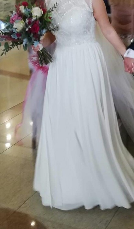 Sukienka jest w kolorze śmietanki. Góra w formie "koszulki" z mieniącym się przodem, z tyłu siatka i wycięcie w kształcie łezki. Dół sukienki został uszyty z muślinu, pięknie ukladającego się w tańcu. Dodatkowo sukienka posiada rozcięcie na prawej nodze. Sukienka zapinana jest z tyłu na zamek. Dzięki Paniom z salonu ma sprytne rozwiązanie na biustonosz (dla dziewczyn o większym biuście, oraz dla tych, które źle czują się bez biustonosza). Dodatków sukienka ma wszyte fiszbiny, co wpływa na poprawę komfortu jej noszenia.